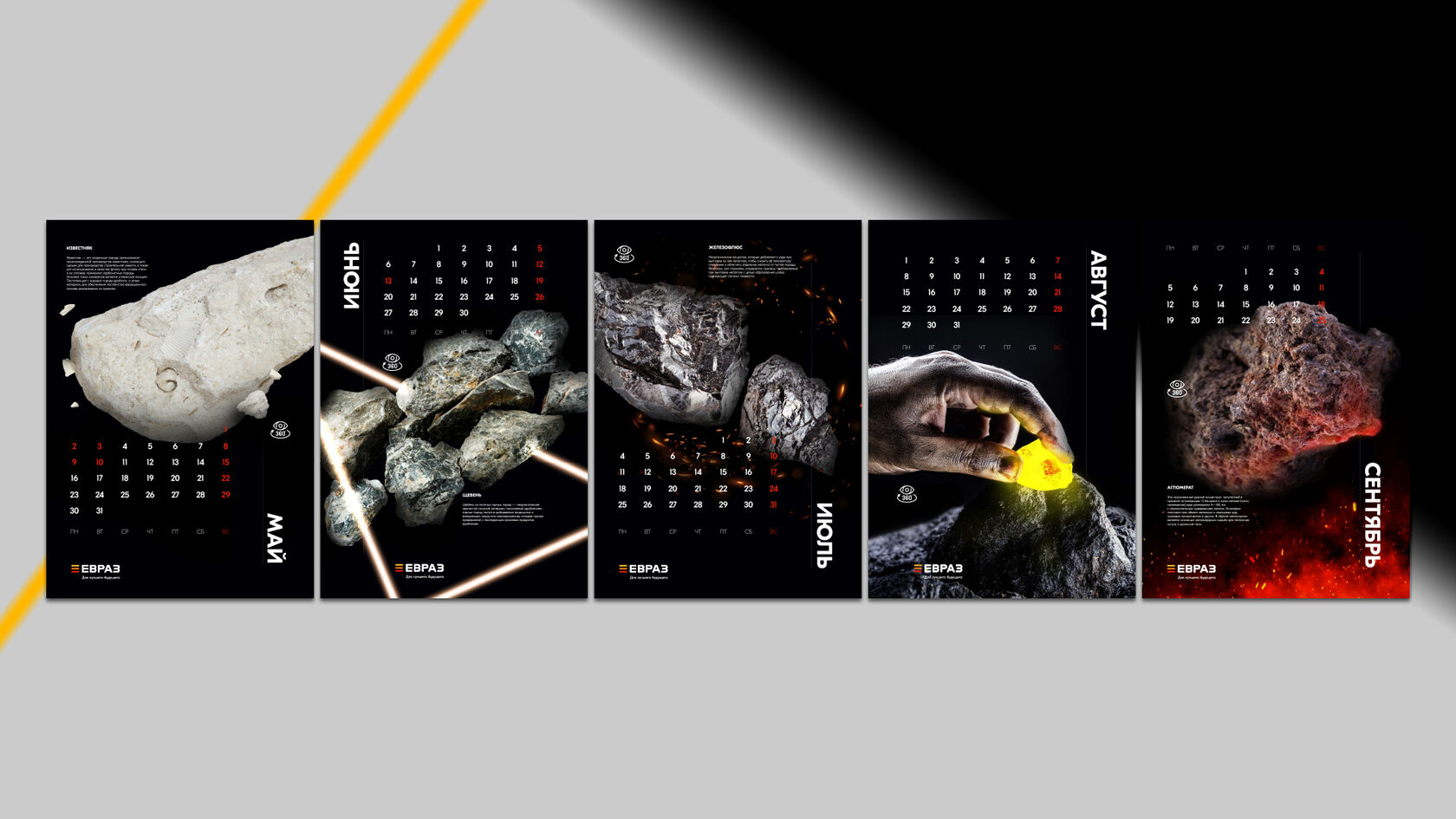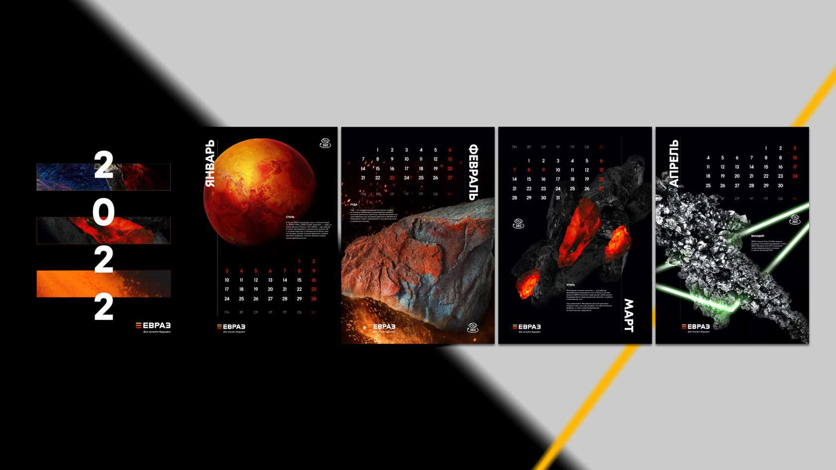 РЕШЕНИЕ ПО КОНЦЕПЦИИ Для каждого месяца выбрана продукция компании: уголь, сталь, руда, ванадий и провести креативную макросъемку, демонстрирующую текстуры и формы материалов, с применением световых эффектов или неона.